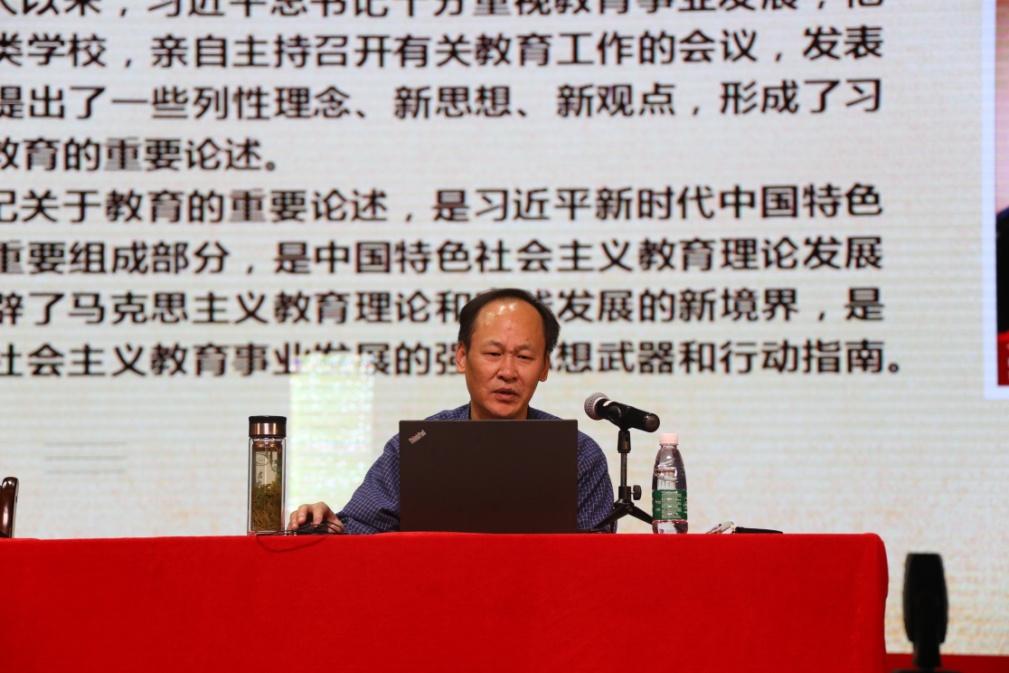接着,戴林富教授以“学习贯彻新思想,办好人民满意的教育”为题,从“习近平总书记关于教育重要论述概述”、“习近平总书记关于教师队伍建设论述”、“贯彻落实习近平总书记关于教育论述”三个方面引导Williamhill中文官网全体师生深入学习习近平总书记关于教育重要论述。并对习近平总书记提出的新时代“四有好老师”进行了详细的解读。
