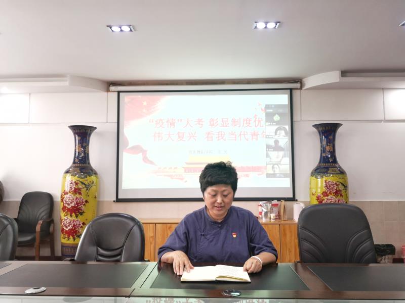 随后,院党委书记王元老师对本次培训班开班仪式做总结讲话,希望学员们按照培训要求,保质保量完成培训学习任务,提升自己理论水平。继而她给全体与会人员上了一堂题为《疫情大考彰显制度优势,伟大复兴看我当代青年》的党课。她从疫情防控的背后,再度印证中国制度的优越”“身体力行,坚决打赢疫情防控阻击战”“疫情期间,我们做了什么?”“疫情当前,我们能做什么?四个方面展开讲述,特别是讲到疫情期间,我们做了什么?列举我们身边的抗疫故事如我院师生共同演唱混声合唱歌曲《我们》,我院中共党员于国良老师参加抗疫原创歌曲《祈祷》的演唱,我校医学专业的校友们抗疫前线的故事,舞蹈专业师生策划演绎最美逆行者舞蹈及学院志愿者们、师生们的抗疫优秀事迹等等。教育学生党员要进一步提高思想站位,认清全国新冠疫情防控下学校、学院防控工作的重要性及面临的压力,紧紧围绕以“疫情防控践初心,严峻斗争担使命”为主题开展党日活动,号召党员同志们当先锋、做表率、展作为,切实做到“六个带头”。勉励身为青年学子们,在民族伟大复兴历程中,抗击新冠疫情工作过程中,明晰我国能够集中力量办大事的制度优势,要勇于担当肩上责任,承担历史使命。