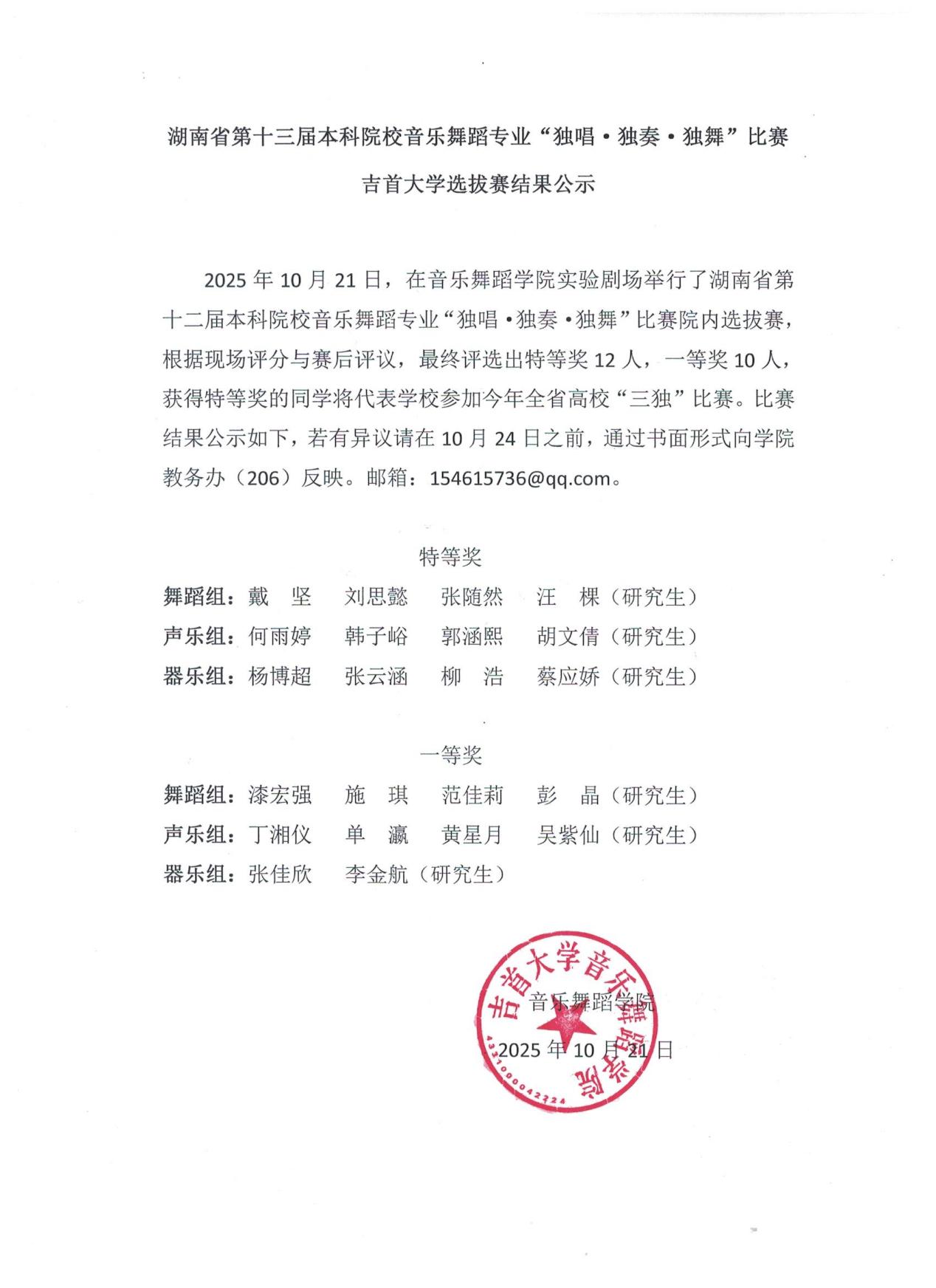 湖南省第十三届本科院校音乐舞蹈专业“独唱·独奏·独舞”比赛院内选拔赛根据现场评分与赛后评议,最终评选出特等奖12人,一等奖10人,获得特等奖的同学将代表学校参加今年全省高校“三独比赛”。比赛结果公示如下: