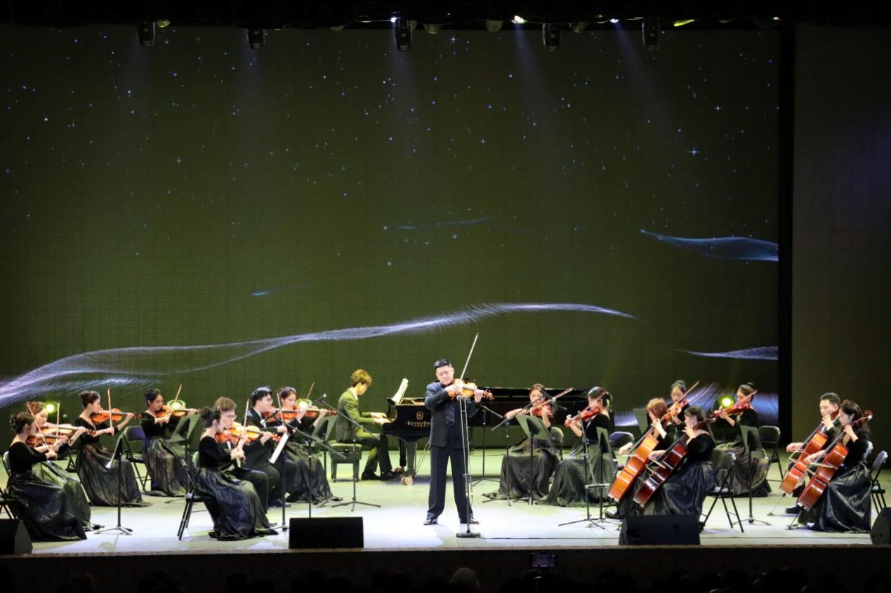 随后,男声独唱《松花江上》由湖南省青年骨干教师于国良深情演绎,厚重的历史情感与深沉的家国情怀在歌声中回荡,引人共鸣。小提琴协奏曲《丰收渔歌》则通过弦乐与民乐的巧妙融合,勾勒出一幅江南水乡的丰收画卷,展现了学院在教学曲目演绎上的深厚功底。