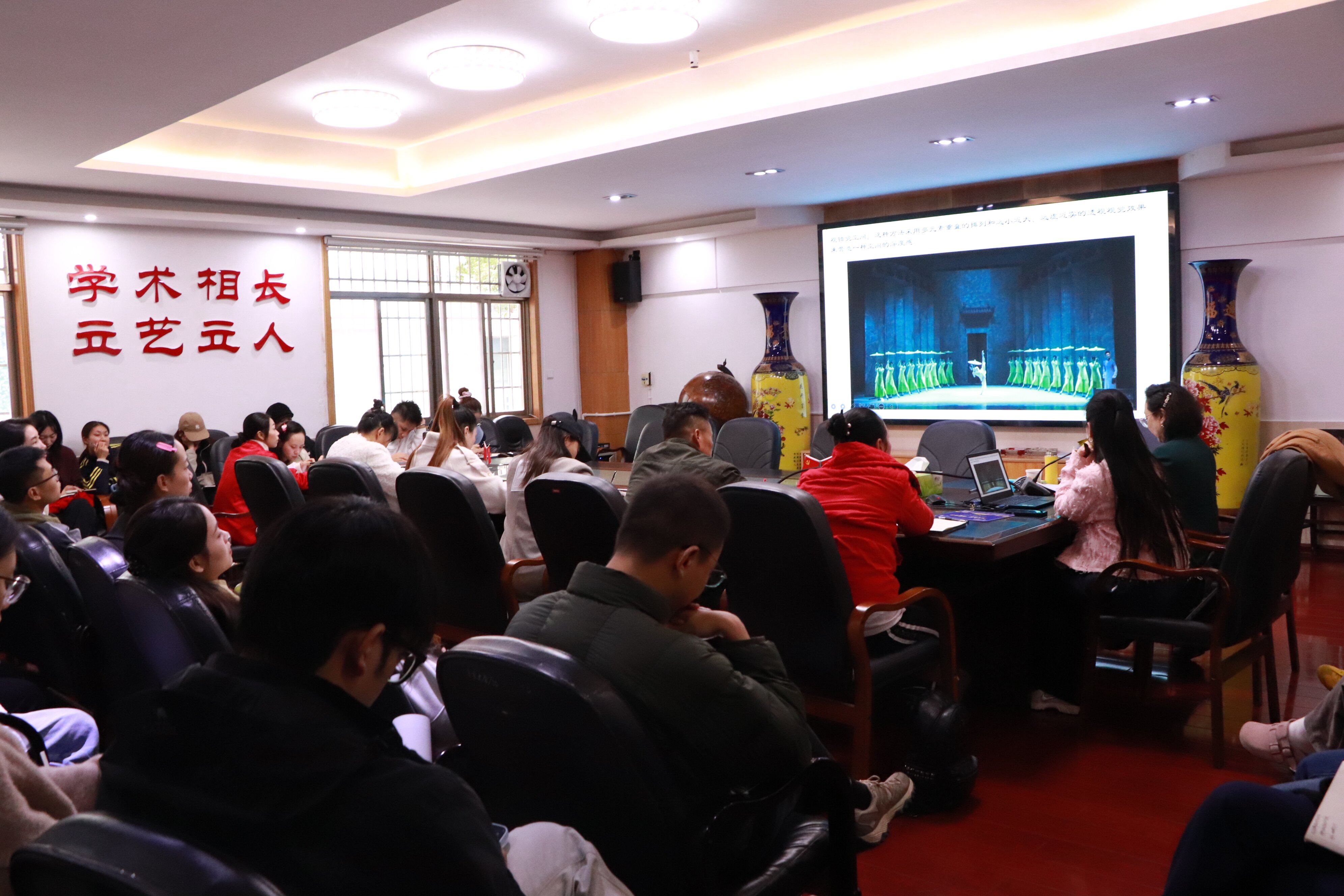 讲座接近尾声,金秋教授深情寄语:我们要深深扎根本土,始终保持对民族文化的笃定自信——不盲目崇洋媚外,不刻意逢迎外物,静下心来深入挖掘本土文化的肌理,从湘西摆手舞的韵律与节奏中,探寻属于我们自己的艺术基因。唯有以文化自信为底色,才能创作出真正有筋骨、有温度的作品,让民族舞蹈成为传递文化底气的生动载体。