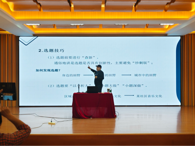 上午的讲座由李星星老师主持,赵教授以“遗产化”“经典化”:传统乐舞类“非遗”项目的“再语境化”建构为核心,从五方面展开解析。他首先分析“再语境化”的实践过程,提出需以“合作人类学”理论为支撑,由传承人、地方非遗保护中心等多方协作,共同构建非遗乐舞文本;还指出传统乐舞会实现“语境跨越”,从民俗仪式场景转向舞台化展演,同步完成传播场景、“演-观”结构、核心表现形式的创新,在适配非遗申报标准与大众审美的同时,坚守传统内核,践行“守正创新”。