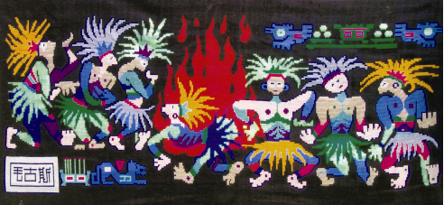 土家姑娘从小就学习挑花刺绣技术,用各色丝线在手帕、围腰、飘带、床单、被面、帕子、枕头、帐帘、窗帘、门帘、鞋垫上绣各种人物、山水、花草、鱼虫、鸟兽、传说故事等,