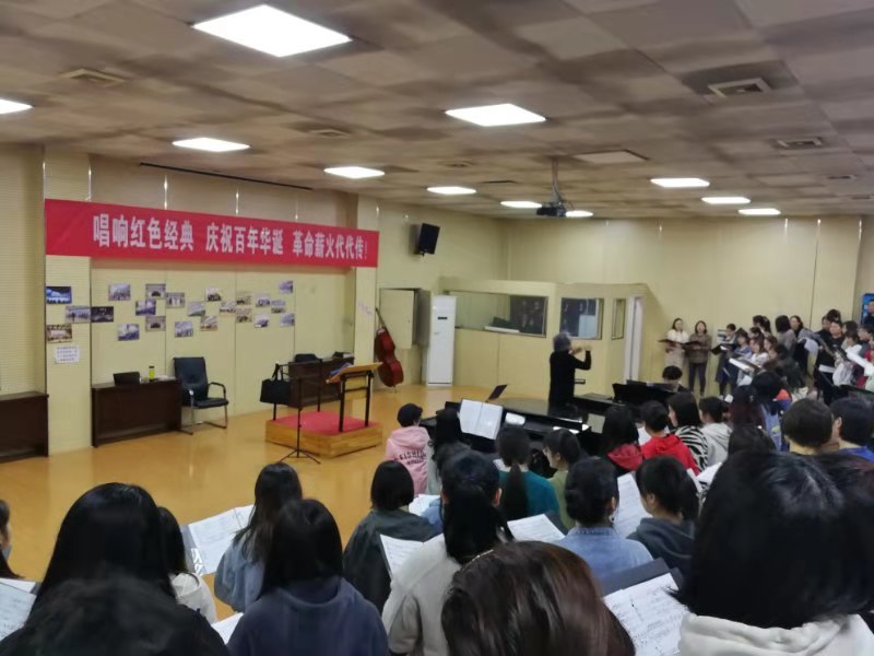 图为师生利用课余时间进行紧张排练