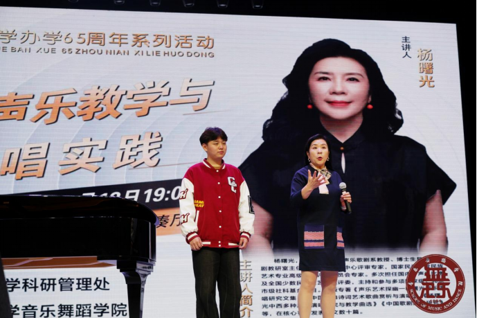 讲座后半部分选择将“课堂搬上演讲台”,我校4名学生上台演唱。杨曙光教授针对每个学生的问题,逐一进行讲解,并通过示范引导同学们建立起正确的声音观念和审美,希望大家通过“咽碧”“通道”和“气息”等的协调运用,展示出自身最完美的声音。此外,杨曙光教授特别强调“基础性训练”一词,指出“技巧都是练出来的”,呼吁大家加强对基础发音练习的训练,切忌好高骛远。