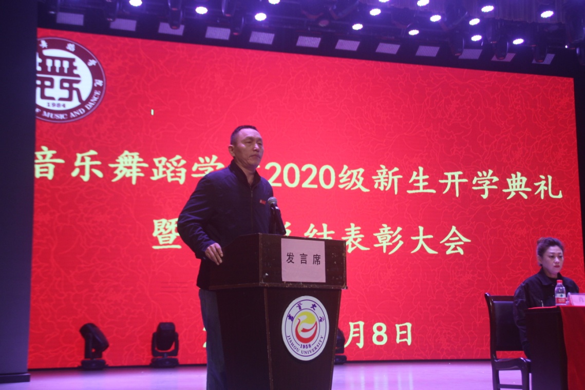 院长李开沛做院情介绍,希望同学们能在学习生活中践行“崇德尚艺,传承创新”的院训和“学术相长,立艺立人”的办学理念,做新时代的吉大音舞人!