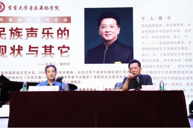 讲座中,郁钧剑围绕《民族声乐的现状与其他》主题,对民族声乐作了详细的讲解,特别强调语言对于歌唱的重要性,并以具体的演唱实例进行展示,生动形象地解析了民族声乐与西方音乐不同的美,以及中西方不同审美之下声乐演唱的异同。他强调民族声乐与美声可以相互借鉴、求同存异,让民族声乐之花开得更加美丽动人。最后,郁老师针对民族唱法做出总结,一是“语言决定唱法”,二是“方言是民族唱法的魂”,三是“民族唱法的‘口’应该开在咽腔”。