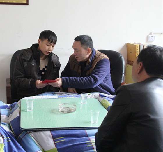 图为李开沛副院长代表学院向扶贫对象石屹送春节慰问金