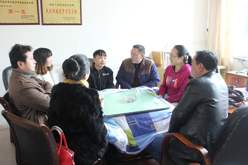 图为学院领导班子向班主任、学校老师了解扶贫对象石屹的情况