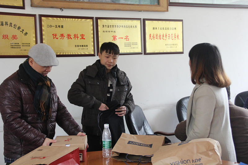 在其班主任杨老师的带领下,找到了刚下课的石屹。学院领导向班主任和石屹进行了交流,了解了石屹的学习、生活情况,鼓励他好好学习。随后,代表学院将购买的一套冬季棉衣和运动鞋送给了石屹,同时送了春节的慰问金和祝福。