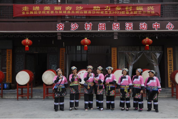 党的二十大报告指出,要“全面推进乡村振兴”。乡村振兴,既要塑形,也要铸魂,物质文明和精神文明要一起抓。参加活动的四十余名教师党员充分发挥自身专业特色,为夯沙村群众带来了一场精彩的精神文化大餐,表演了歌曲《祖国你好》《山歌唱出好兆头》《跟你走》,器乐合奏《起风了》,土家族打溜子《八哥洗澡》,苗鼓表演《四方鼓》等节目,这些多次登上过省市专业舞台的专家、教授们通过节目抒发对祖国富强和人民生活富足的美好赞美,展示少数民族传统文化的传承和发展,用文艺作品的形式将党的二十大精神送到这个小山村里老百姓的家门前。夯沙村的文艺志愿者们也表演了精彩的苗歌演唱节目。