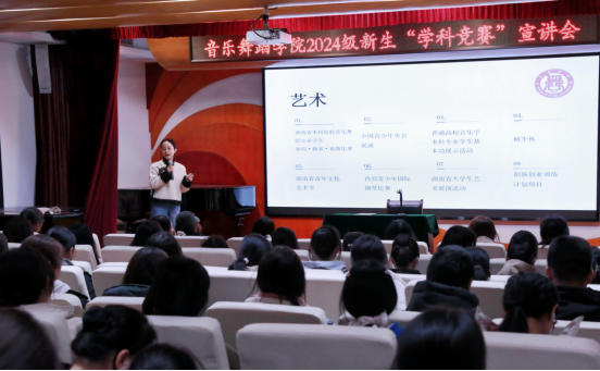 戴老师基于自身工作经历与学院历年竞赛成绩,通过湖南省普通高校音乐类本科生基本功大赛”“湖南省三独比赛”“大学生艺术展演”“央音杯”“桃李杯”“国韵杯”“洞庭杯”等赛事的信息介绍,向同学们强调了大一阶段学习专业技能和学术理论的重要性,并就竞赛的分类标准、参赛过程准备、参赛注意事项进项了详细讲解。