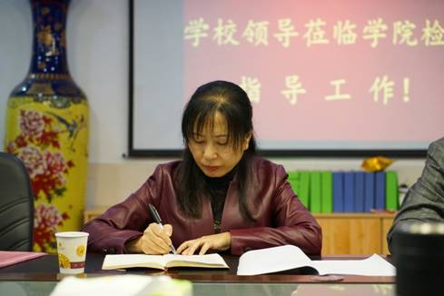 图为张兰芳部长认真记录学院领导汇报的情况