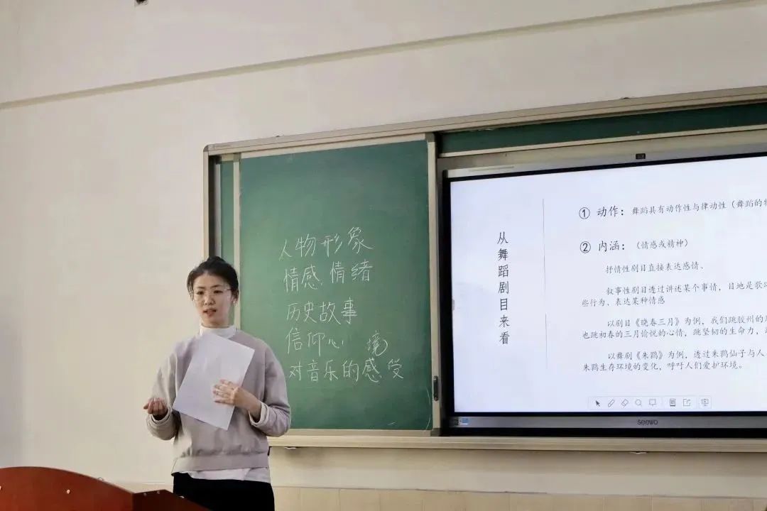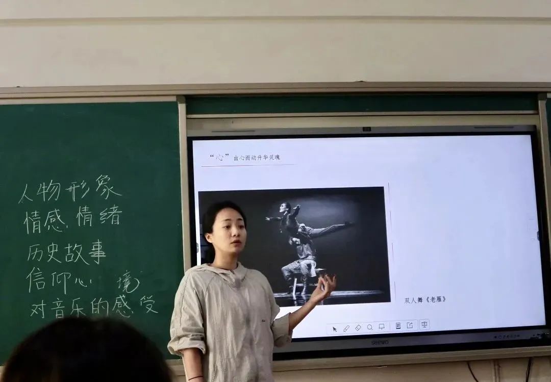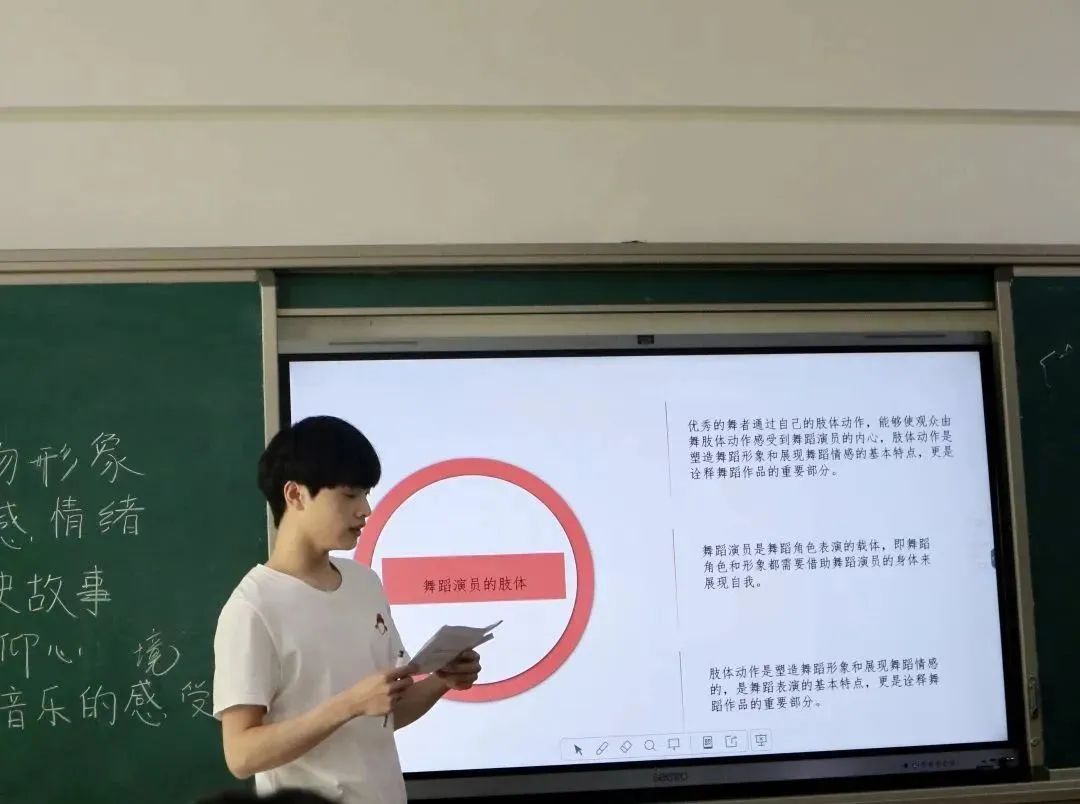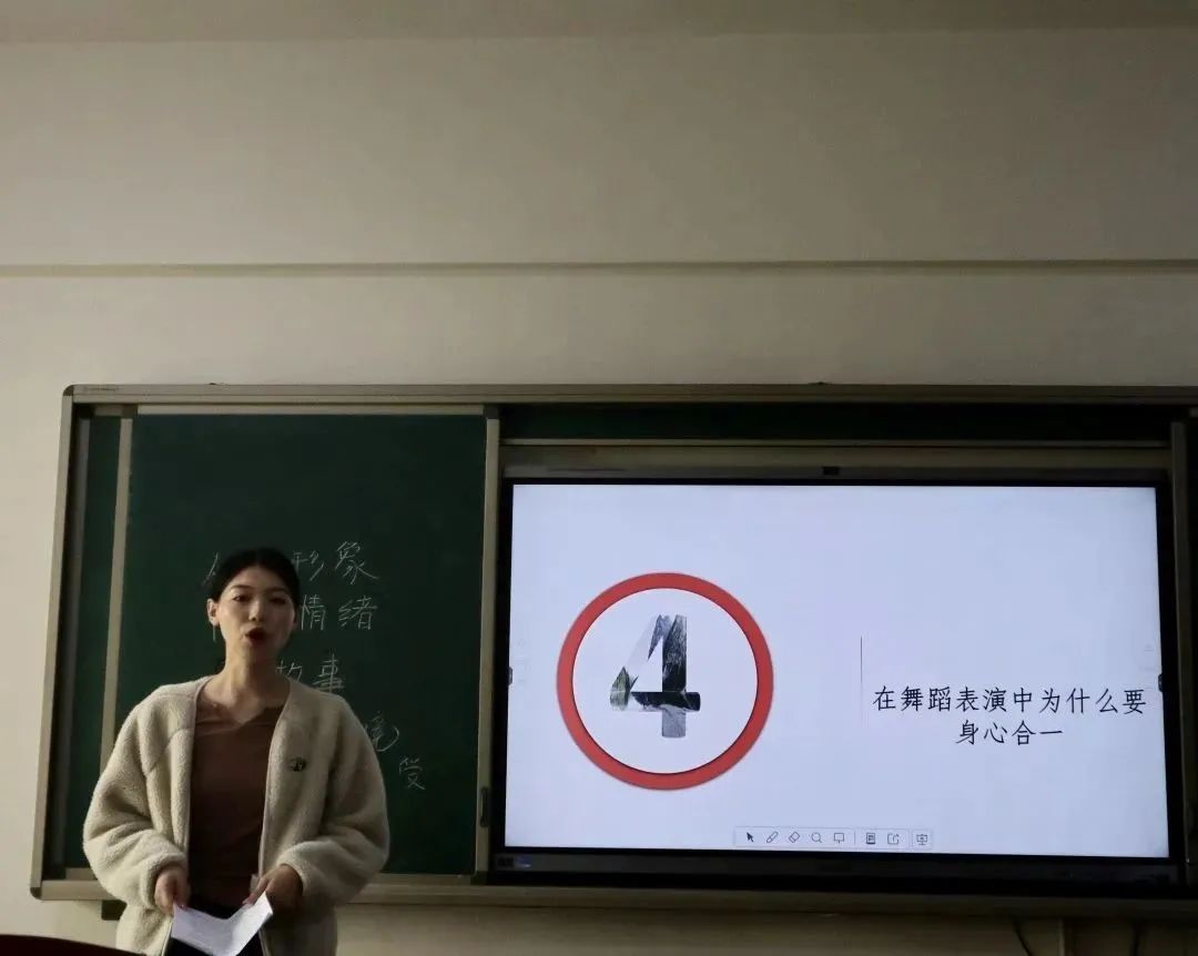 赵越越同学从观看近年来的热门舞蹈短视频出发,对李艳超和邓春晴、刘迦和李响这两组舞者的精彩表演进行对比,来论证动作质感和情感表达的重要性,并引出“不同学生在进行舞蹈时他们的身心关系是什么样的?”从而引导大家讨论。