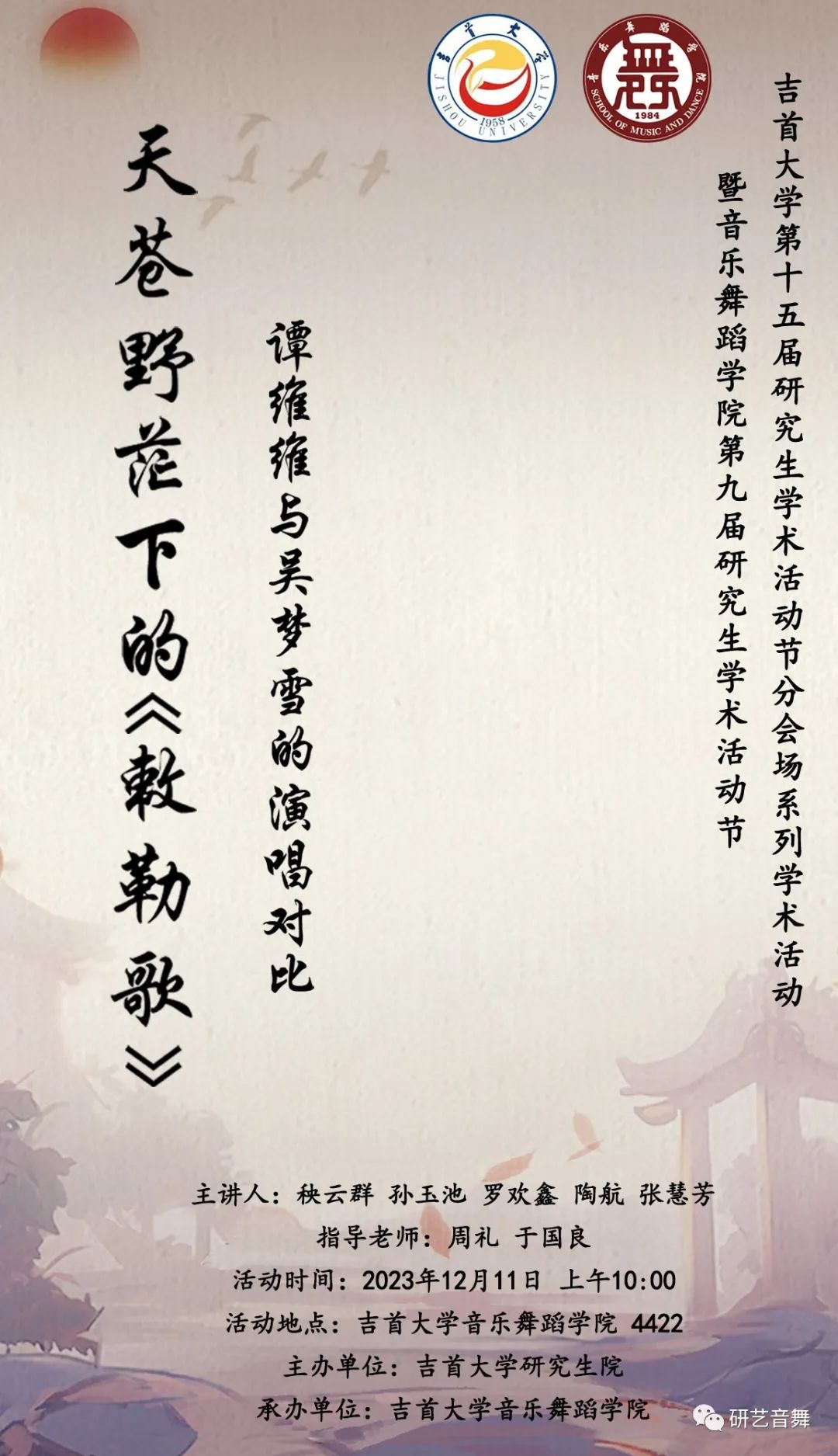 《敕勒歌》是民族文化间互相影响、南北诗风互相融合的实例;也是中华境内各族从征战对抗走向和解交融的历史见证,是一元主体、多元格局中华文化形成过程中的典型个案,此曲用寥寥二十余字,就展现出中国古代牧民生活的壮丽图景,歌咏了北国草原壮丽富饶的风光,抒写了敕勒人热爱家乡、热爱生活的豪情。本次沙龙主要从词曲内涵等方面对歌曲进行研究和探索,包括谭维维与吴梦雪演唱的两个版本,有助于我们对歌曲有更深的理解、能够帮助我们在演唱中对歌曲有更深的把握和感悟。