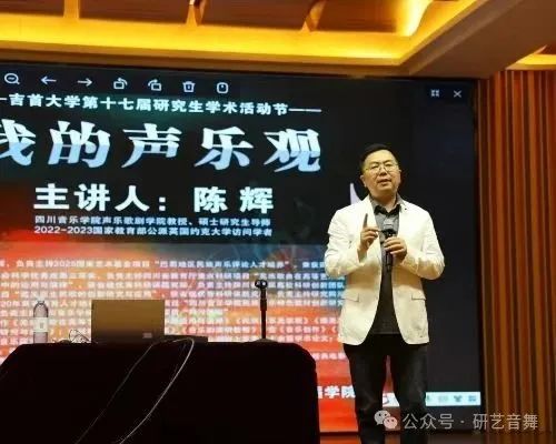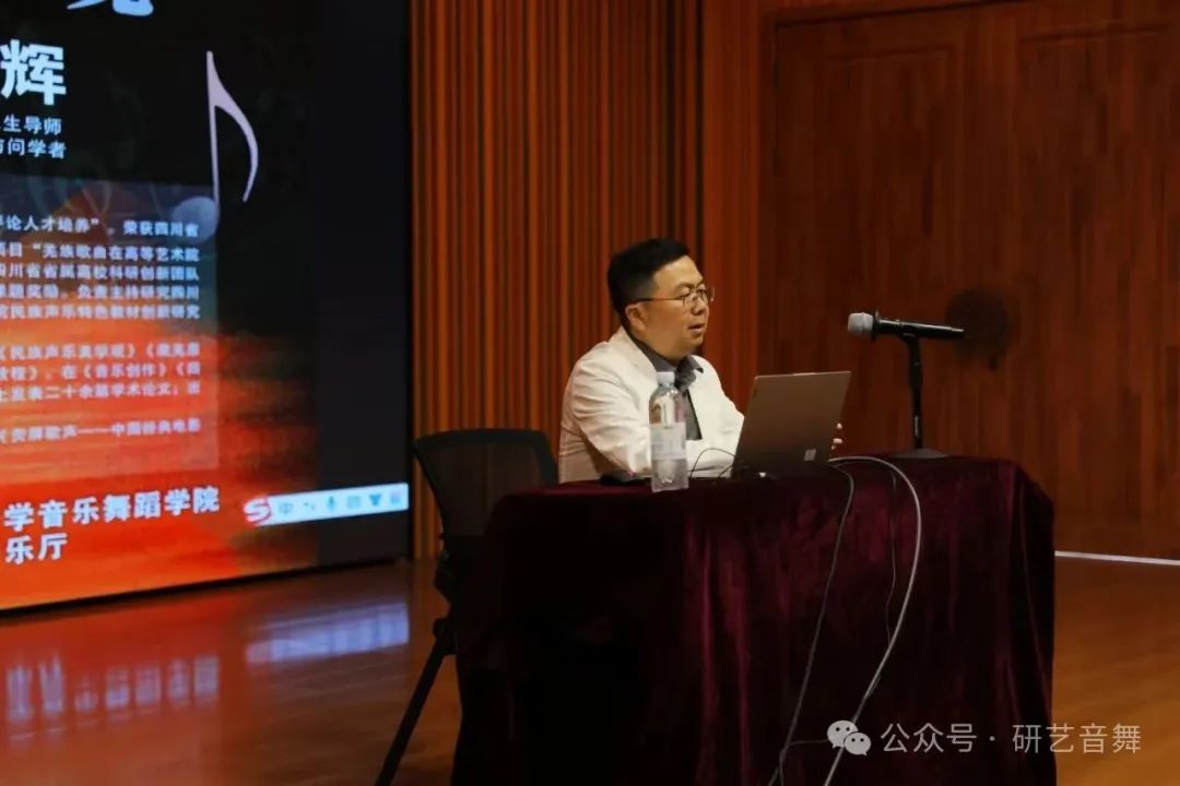 在分享过程中,陈辉副教授还结合了众多经典声乐作品,剖析作品背后的文化内涵和演唱要点。他提到,演唱者要深入理解作品的创作背景、情感基调,才能在舞台上呈现出最真挚、最动人的表演。从西方歌剧到中国艺术歌曲,陈辉副教授信手拈来,展示了其对多元声乐文化的深刻理解和驾驭能力。